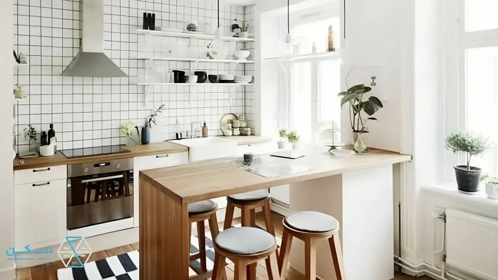 - جزيرة أو بار: يستخدم كفاصل بصري وسطح عمل إضافي.