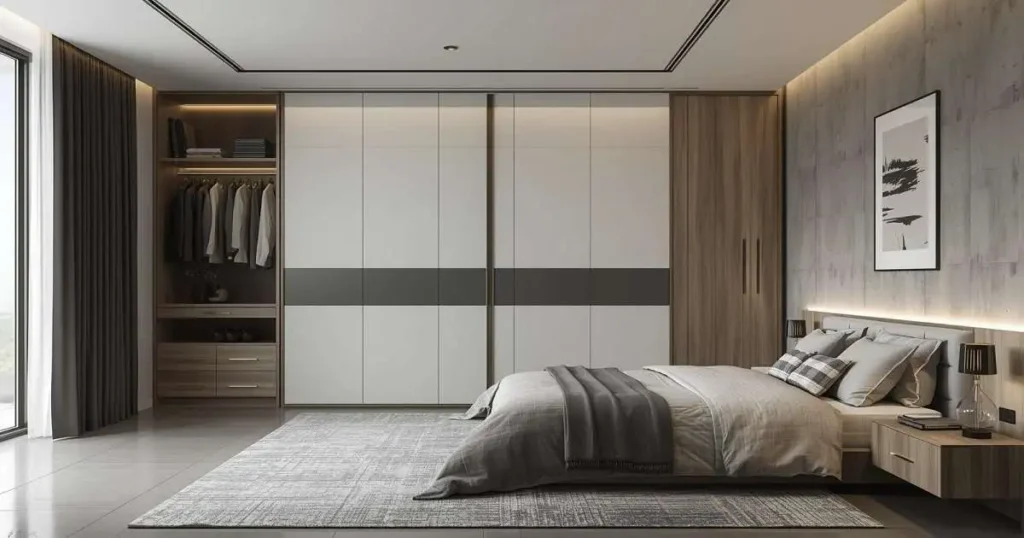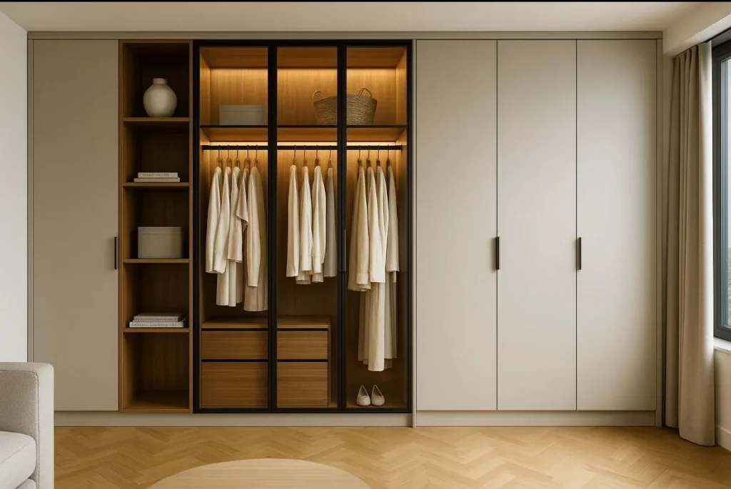 إذا كانت المساحة محدودة، فإن تفصيل دولاب ملابس في الجدار من أفضل الحلول الحديثة. هذا النوع يندمج مع تصميم الغرفة ويوفر مساحة حركة أكبر، ولهذا يتم اعتماده كثيرًا ضمن مشاريع تفصيل خزائن حديثة في الشقق الحديثة بالرياض.